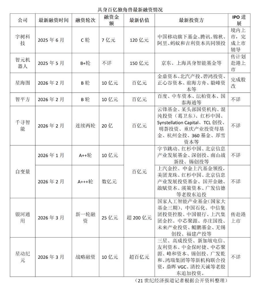开年以来,还有自变量、星海图、智平方、千寻智能这4家企业纷纷宣布完成10亿-20亿元的新融资,晋升百亿估值独角兽。而在2025年时,估值已经突破百亿的就有宇树科技、智元机器人、银河通用这3家公司。
