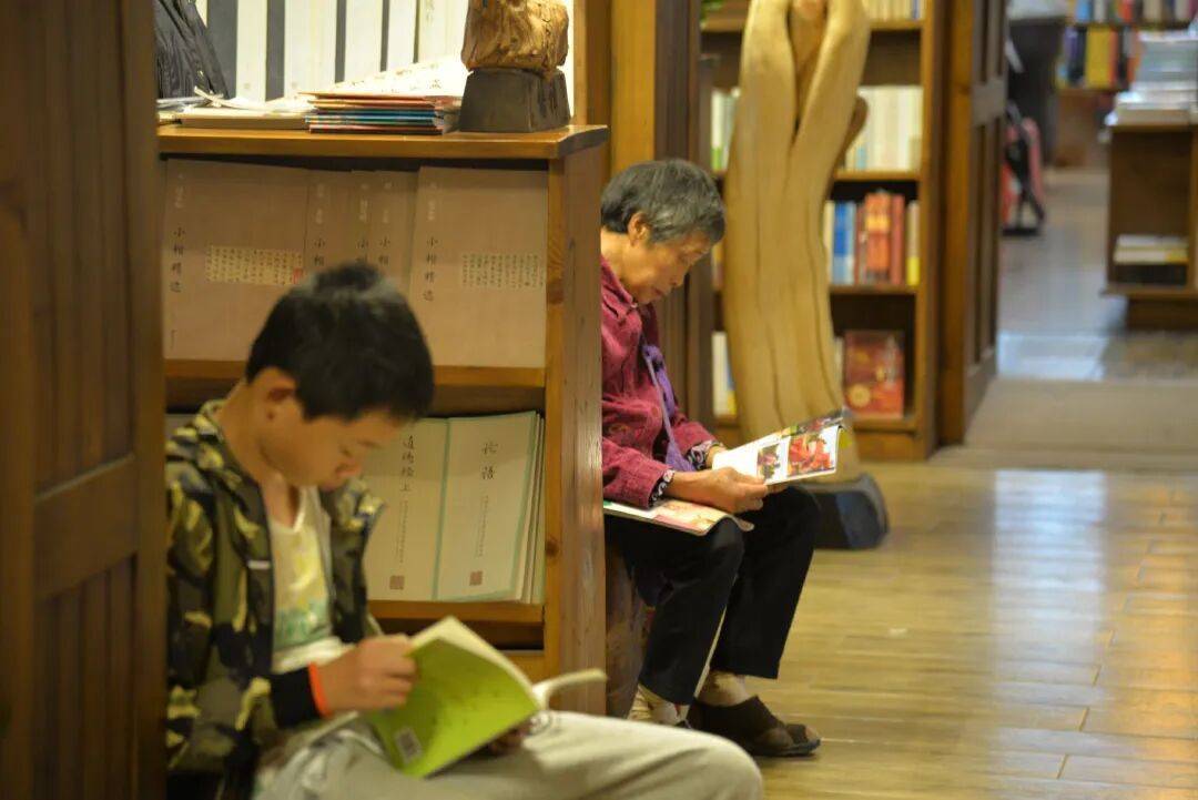 在书屋的一角,一小一老坐在书柜旁,各自翻阅着自己喜欢的书籍。@朱小根不论晴雪,不论年岁。