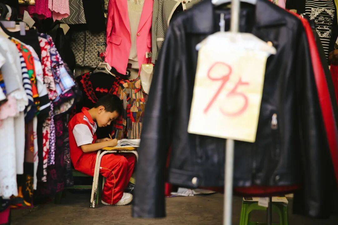 一家服装店铺里,小朋友正在奋笔疾书。门口一件95元的招牌非常惹眼,仿佛在提醒小朋友要努力读书,争取100分!@金粟山