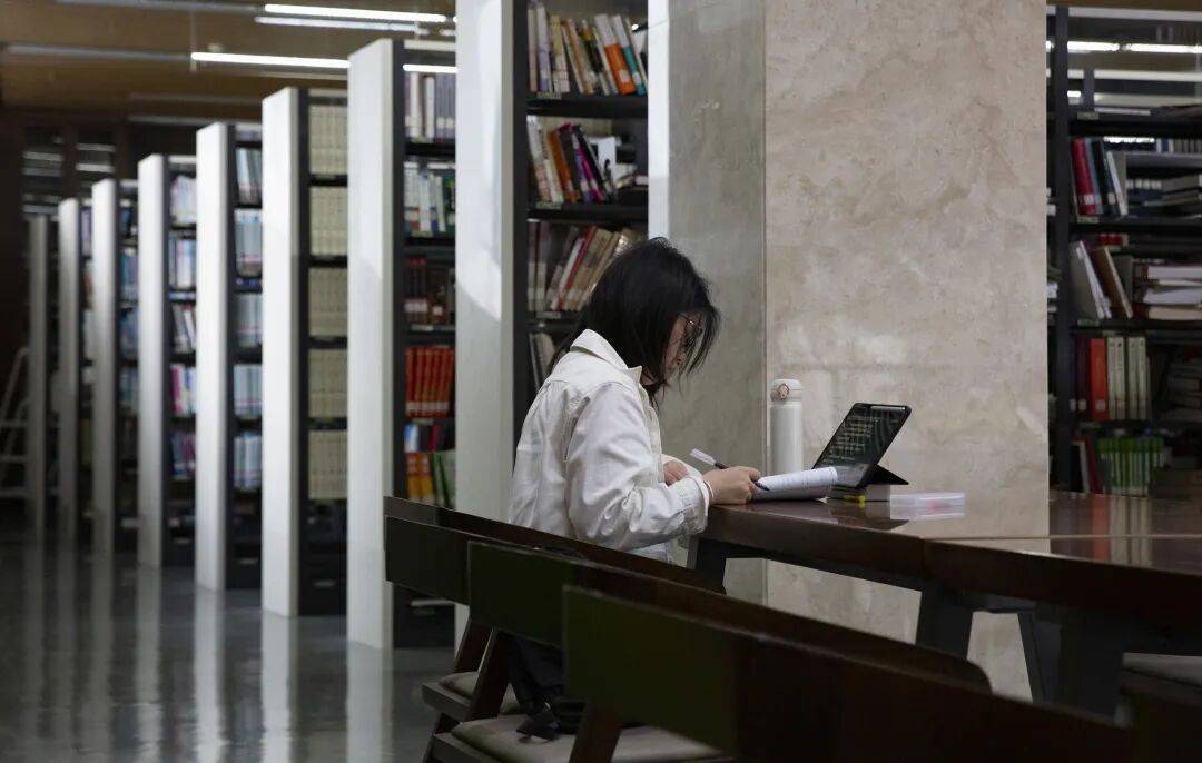 图书馆内,女生静阅书卷,人与字相对,光阴也屏息。@时光像册