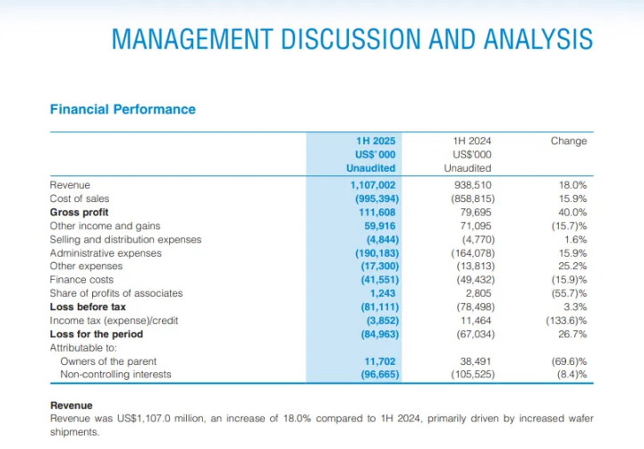 华虹半导体的财务数据略显“矛盾”。根据最新的财务报告,华虹半导体在2025年上半年实现了11.07亿美元的销售收入,相较于2024年同期的9.385亿美元,同比增长了18.0%。同期,公司的销售成本为9.954亿美元,同比增长15.9%。在利润归属方面,最终归属于母公司所有者的净利润为1170万美元,与2024年同期的3849万美元相比,同比下降了69.6%。