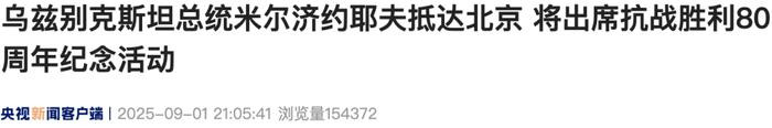 乌兹别克斯坦总统米尔济约耶夫抵达北京,将出席抗战胜利80周年纪念活动