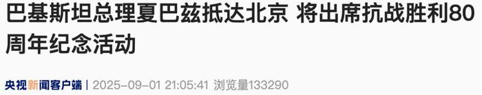 9月1日晚,巴基斯坦总理夏巴兹乘高铁抵达北京,将出席中国人民抗日战争暨世界反法西斯战争胜利80周年纪念活动。