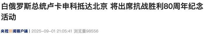 9月1日晚间,白俄罗斯总统卢卡申科乘高铁抵达北京,将出席中国人民抗日战争暨世界反法西斯战争胜利80周年纪念活动。