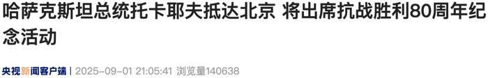 9月1日晚间,哈萨克斯坦总统托卡耶夫乘高铁抵达北京,将出席中国人民抗日战争暨世界反法西斯战争胜利80周年纪念活动。
