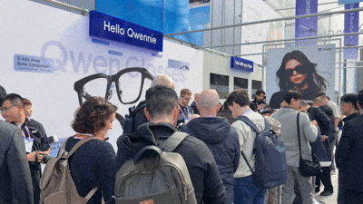 在展馆里,千问AI眼镜与Meta展区比邻而居,外侧始终围着一大圈海外观众,不少人举着手机拍摄,也有人等着试戴体验,现场热度肉眼可见。