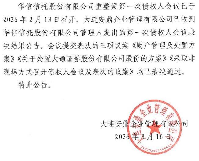【大河财立方消息】3月18日消息配资炒股入门知识,华信信托日前发布《关于安鼎公司收到华信信托股份有限公司重整案第一次债权人会议表决结果的公告》。