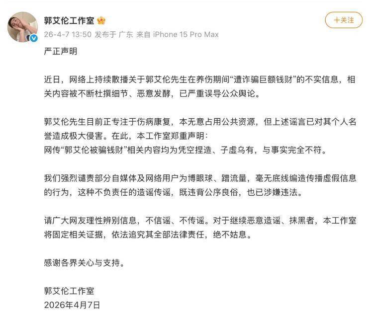 随后,郭艾伦工作室也在微博发布声明,称“郭艾伦被骗钱财”相关内容均为凭空捏造、子虚乌有,将依法追究造谣者的法律责任。