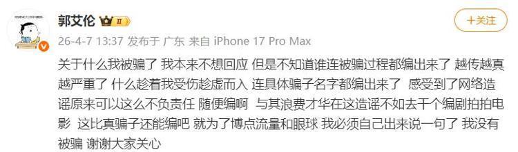 4月7日,中国篮球运动员郭艾伦在个人微博发文回应称,自己并没有被骗,“这比真骗子还能编吧 就为了博点流量和眼球”。