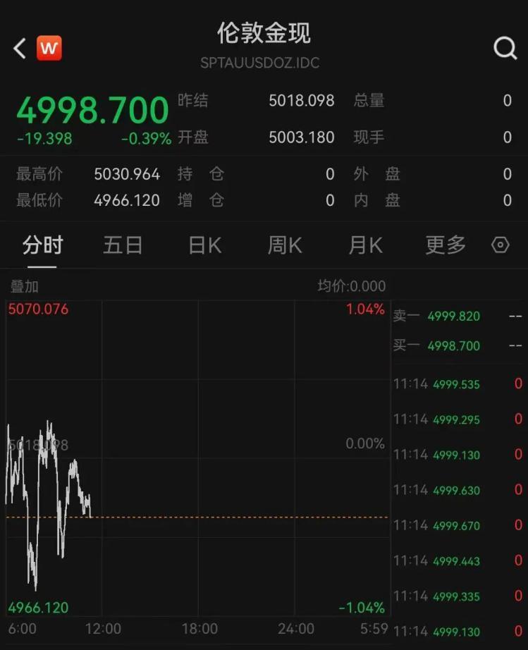 16日上午配资著名炒股配资门户,现货黄金盘中三度跌破5000美元关口。截至发稿,报4998.7美元/盎司,跌0.39%。