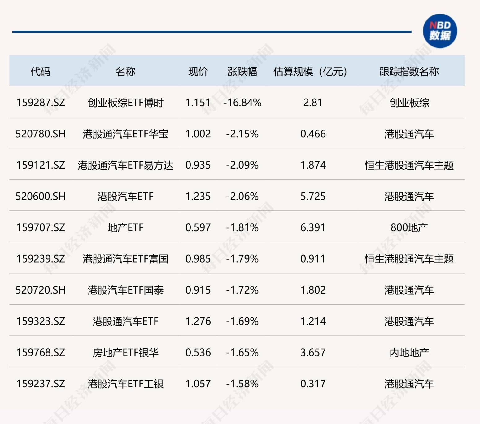 下跌方面,创业板综ETF博时跌超16%,港股汽车相关ETF跌超2%。