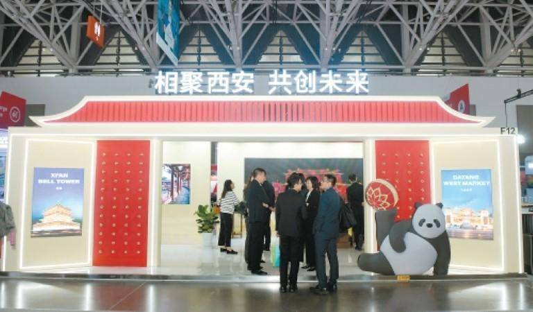 记者在现场看到,西部机场集团展台设计以蓝色为主色调,展台地面特别设置有跑道标线样式的图案,还配有城市文化旅游、地区经济发展、机场发展和嘉宾互动体验等内容,全面展示西安经济、社会、文化、航空枢纽建设等方面的发展成果。对面的西安咸阳国际机场展台,整体呈现中国传统建筑风格,展台内还摆放有礼盒甑糕、桃酥以及各式文创产品,极具西安特色。