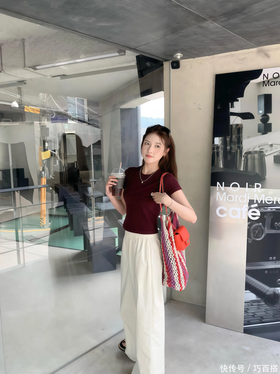 不过大家不用担心,并不是所有深色系T恤都是低调含蓄类型的,像博主身上这类暗红色T恤就是典例,喜欢成为人群焦点的姐妹可以码住,有它在,走到哪里都能赚足回头率。